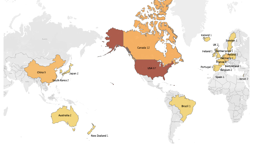 Figure 2. Geographic distribution of RNA and LNP startups. Map of 122 RNA and LNP-focused startups identified using PitchBook data. Companies are concentrated in the United States (67) and Canada (12), with smaller clusters across China, Europe, and East Asia. Because PitchBook primarily captures North American venture activity, Chinese and Indian innovators are likely underrepresented.
