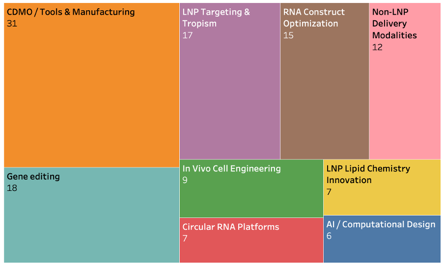 Figure 3. Innovation landscape across RNA and LNP startups. Tree map of 122 emerging companies grouped by primary innovation area, spanning CDMO / Tools & Manufacturing, Gene Editing, LNP Targeting & Tropism, RNA Construct Optimization, In Vivo Cell Engineering, LNP Lipid Chemistry Innovation, Circular RNA Platforms, Non-LNP Delivery Modalities, and AI / Computational Design. Numbers indicate the number of companies in each category
