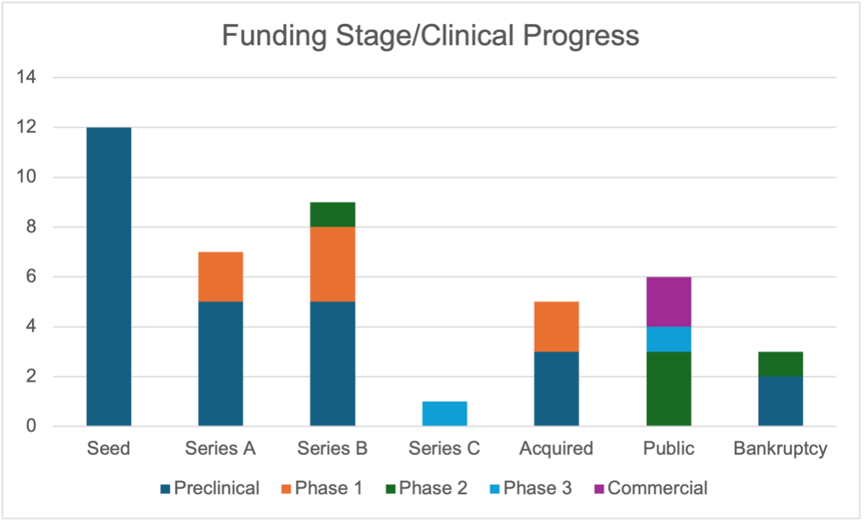 Figure 5. Funding stage and clinical development status of RNA and LNP companies. Stacked bar chart showing the number of companies at each clinical stage—preclinical, Phase 1, Phase 2, Phase 3, and commercial—stratified by funding status, including Seed, Series A, Series B, Series C, acquired, public, and bankrupt companies.