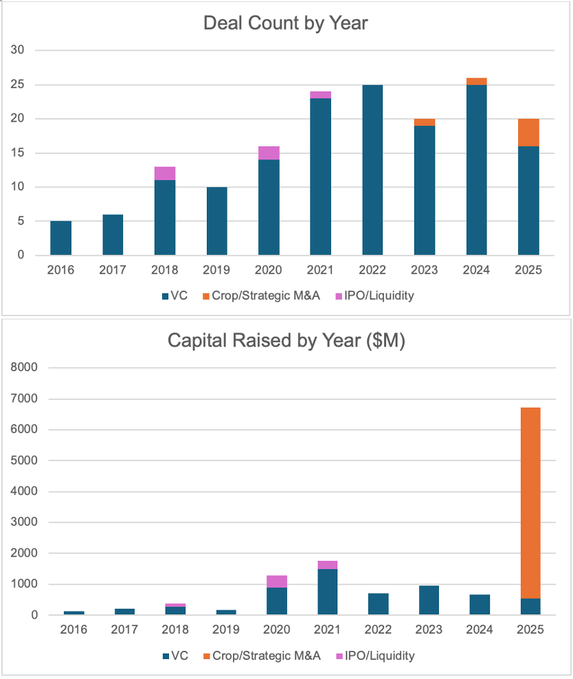 Across the past decade, deal activity increased steadily from 2016 through the pandemic years, with a clear inflection in 2020–2021 as mRNA–LNP vaccines proved clinically and commercially viable. Most transactions during this period are traditional venture rounds, while large corporate acquisitions remain relatively rare. Although deal counts stabilize after 2021, they remain well above pre-pandemic levels, indicating sustained interest in RNA delivery beyond COVID-19. Capital deployed follows a different pattern, driven primarily by a small number of large transactions rather than deal volume, explaining the pronounced spike in 2025 driven by strategic consolidation.